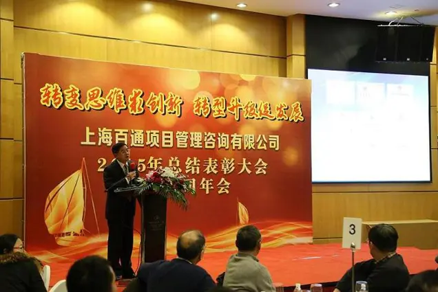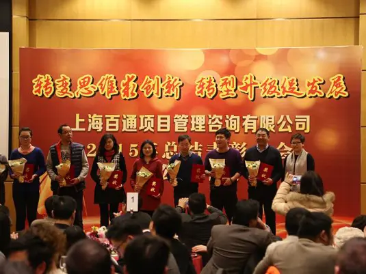 2016年1月23日下午,上海百通項目管理咨詢有限公司2015年度總結表彰大會暨公司年會隆重舉行,公司董事長、總經理王大年,各分管副總、分公司以及部門負責人與百通全體員工歡聚一堂,弘揚先進、表彰典型、喜迎新春。