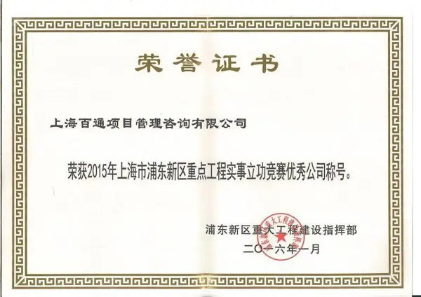 2015年,百通公司上下一心、銳意進取、團結拼搏,在上海市和浦東新區重點工程項目中作出了突出貢獻,取得了優秀成績。日前,在上海市和浦東新區重點工程實事立功競賽評比活動中,公司及個人取得了多項榮譽。公司被授予2015年上海市浦東新區重點工程實事立功“優秀公司”榮譽稱號,這項榮譽也是我司連續第十四年獲得;郭昌麟同志被授予上海市“優秀建設者”榮譽稱號;鄒建文同志被授予浦東新區“優秀建設者”榮譽稱號。