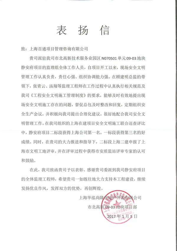 在此,我司致函貴司予以表彰。感謝貴司委派到我司靜安府項(xiàng)目的全體監(jiān)理工程師,希望貴司一如既往地大力支持本工程建設(shè),繼續(xù)發(fā)揚(yáng)優(yōu)良作風(fēng),發(fā)揮雙方的優(yōu)勢(shì),再創(chuàng)輝煌。
