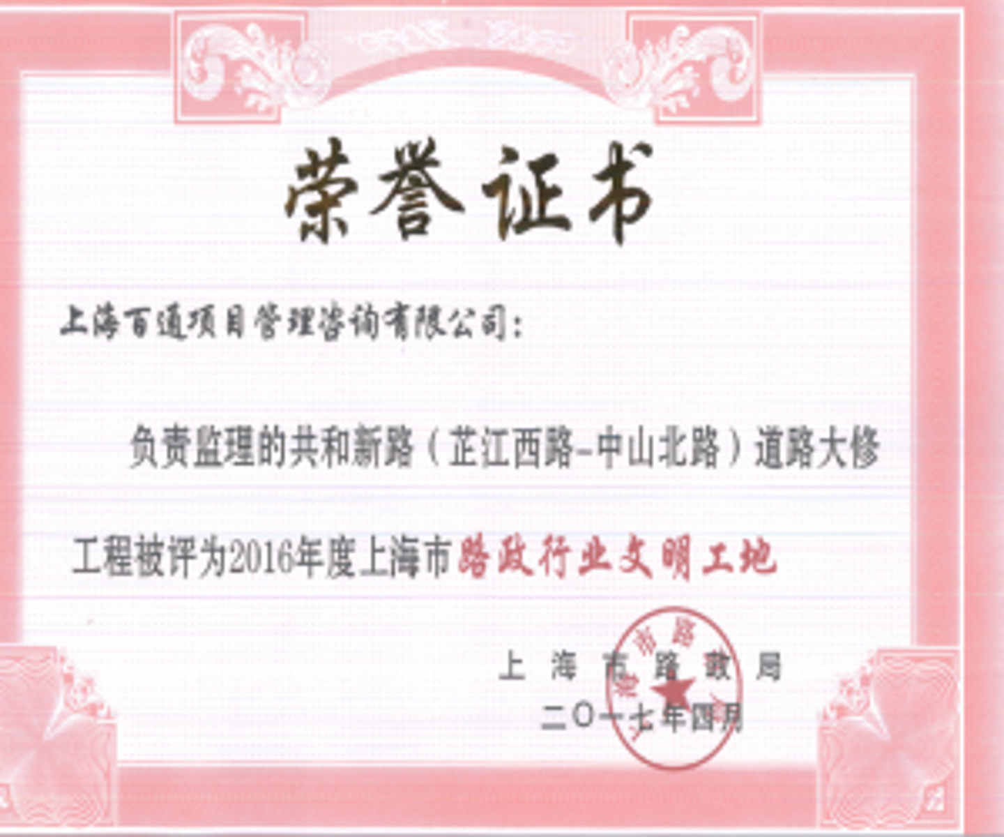 我司监理项目----共和新路道路大修工程获得上海市“路政行业文明工地”称号