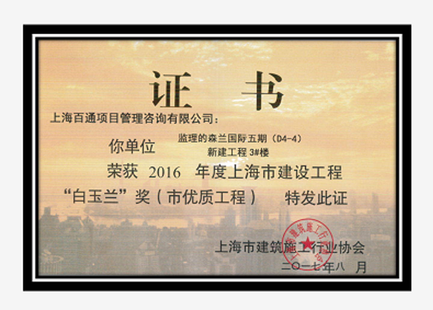 近日,根據上海市建筑施工行業協會發布的《關于頒發2016年度上海市建設工程 “白玉蘭”獎(市優質工程)的決定》,我司監理的森蘭國際五期(D4-4)新建工程喜獲2016年度上海市建設工程“白玉蘭”獎(市優質工程)。