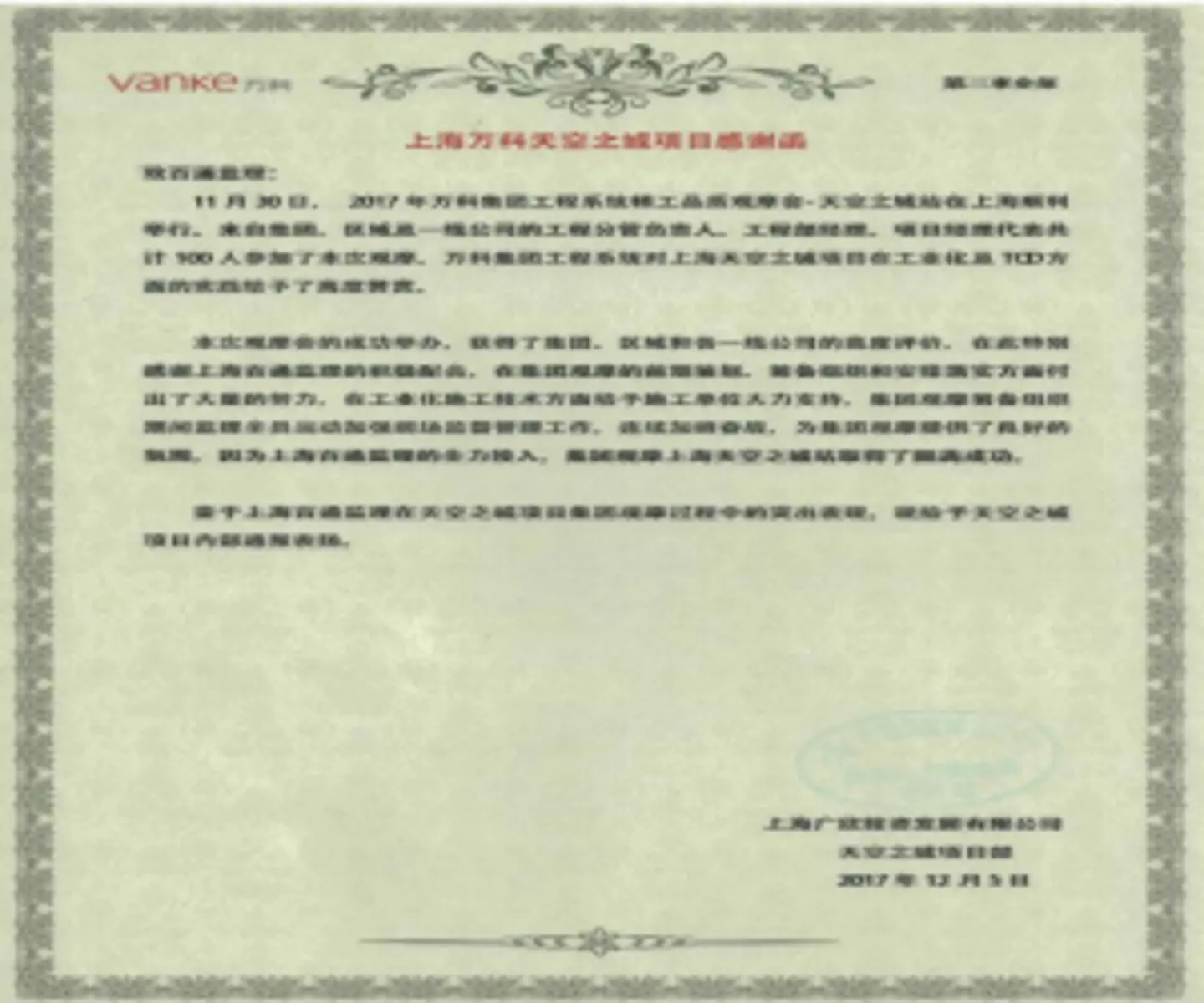 萬科集團(tuán)觀摩活動結(jié)束后,萬科徐涇甲方項目部召開監(jiān)理、總包表彰會,專門致函百通公司監(jiān)理表示感謝并給予表揚。