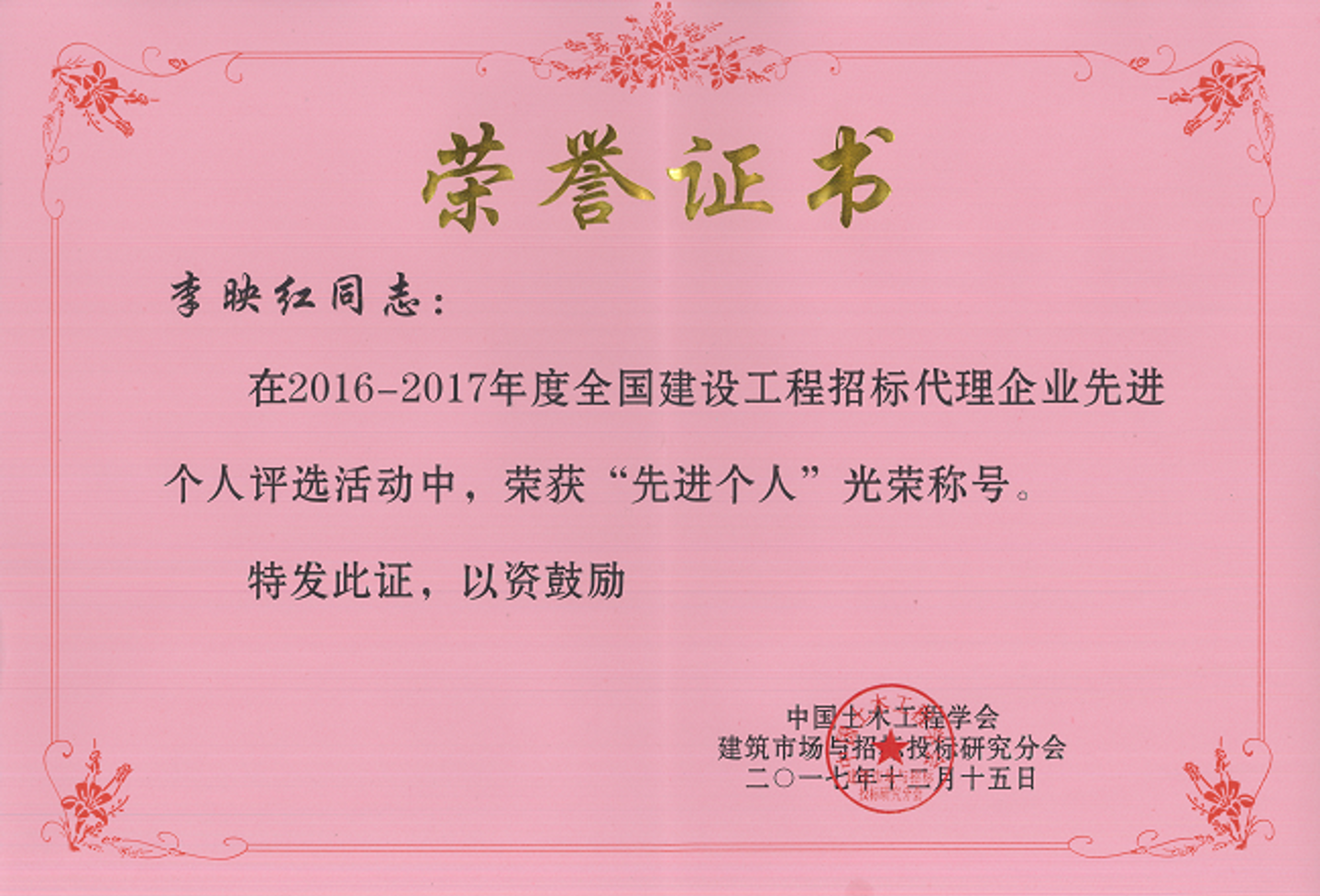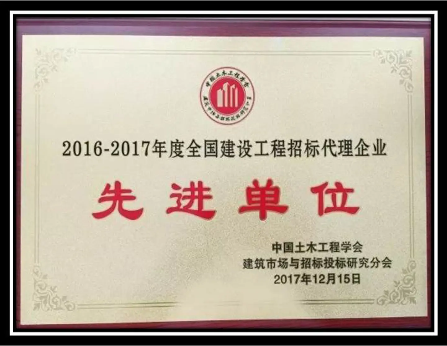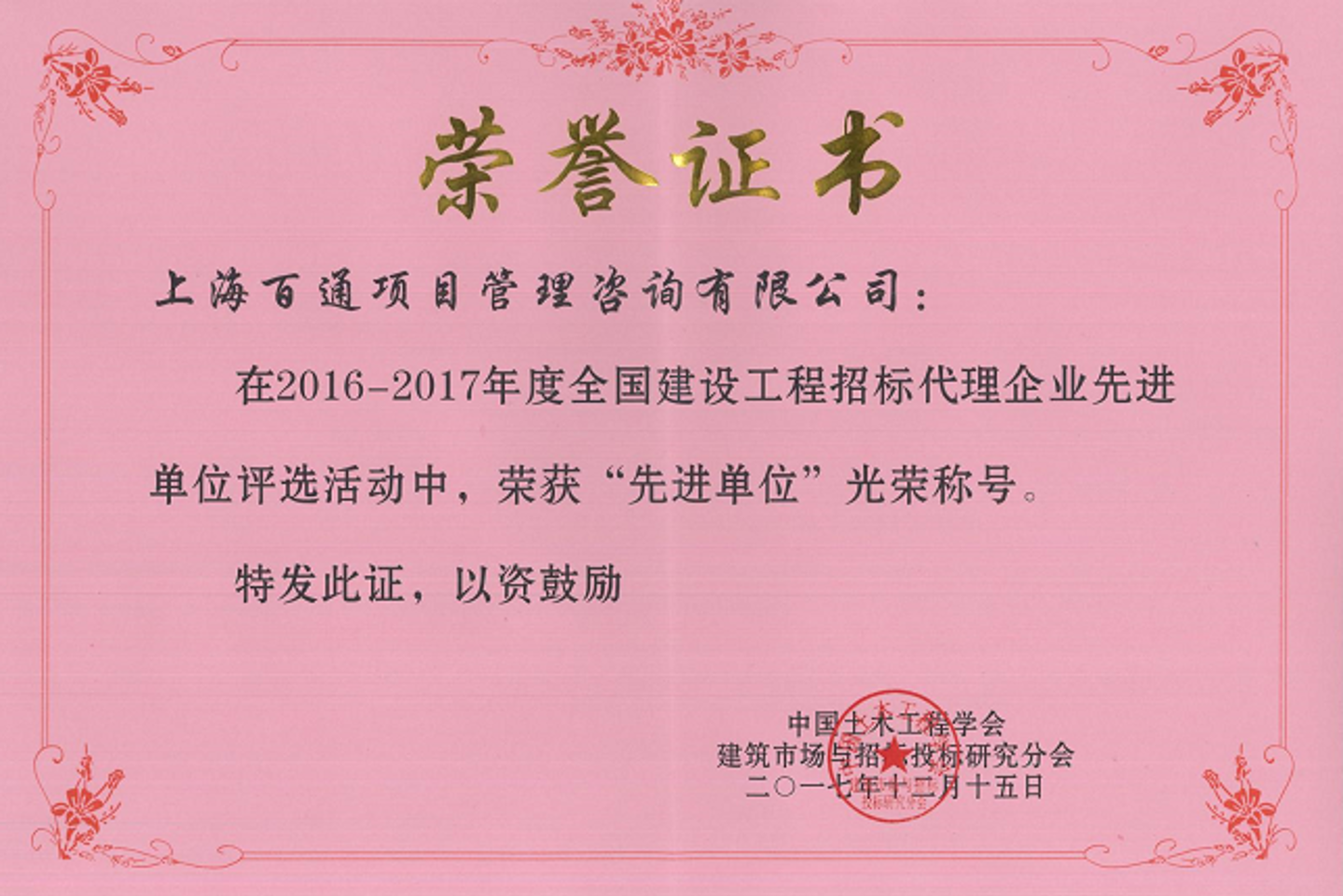 在中國土木工程學會建筑市場與招標投標研究分會的2016年-2017年度建設工程招投標先進單位和先進個人表彰活動中,我司榮獲“2016—2017年度全國建設工程招標代理企業先進單位”榮譽稱號,李映紅同志榮獲“2016-2017年度全國建設工程招標投標行業先進個人”。