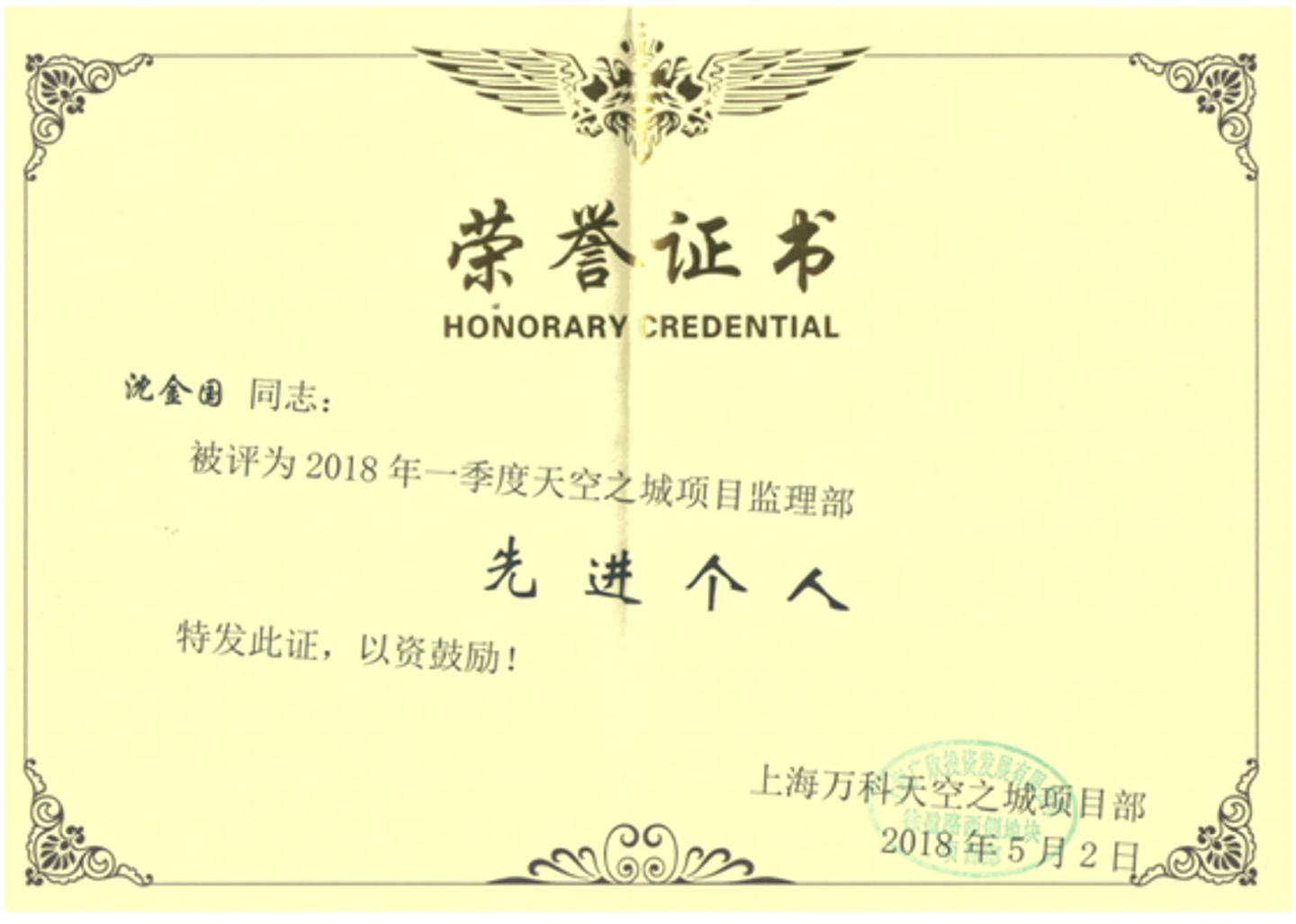 在2018年一季度飛檢中,百通監理組全體動員,對每棟樓進行承包式分工,責任到人,開展安全、質量風險,實測實量等各項檢查。飛檢期間,大家每天早上八點以前到達現場,加班加點,不計得失,發現問題及時協調處理,通過大家的努力和各方配合,經歷萬科一季度兩輪檢查,徐涇萬科項目獲得上海公司一季度飛檢第一名的好成績,為此業主對監理組徐建中、楊國強、沈金國、姚怡潔等四名同志進行嘉獎。
