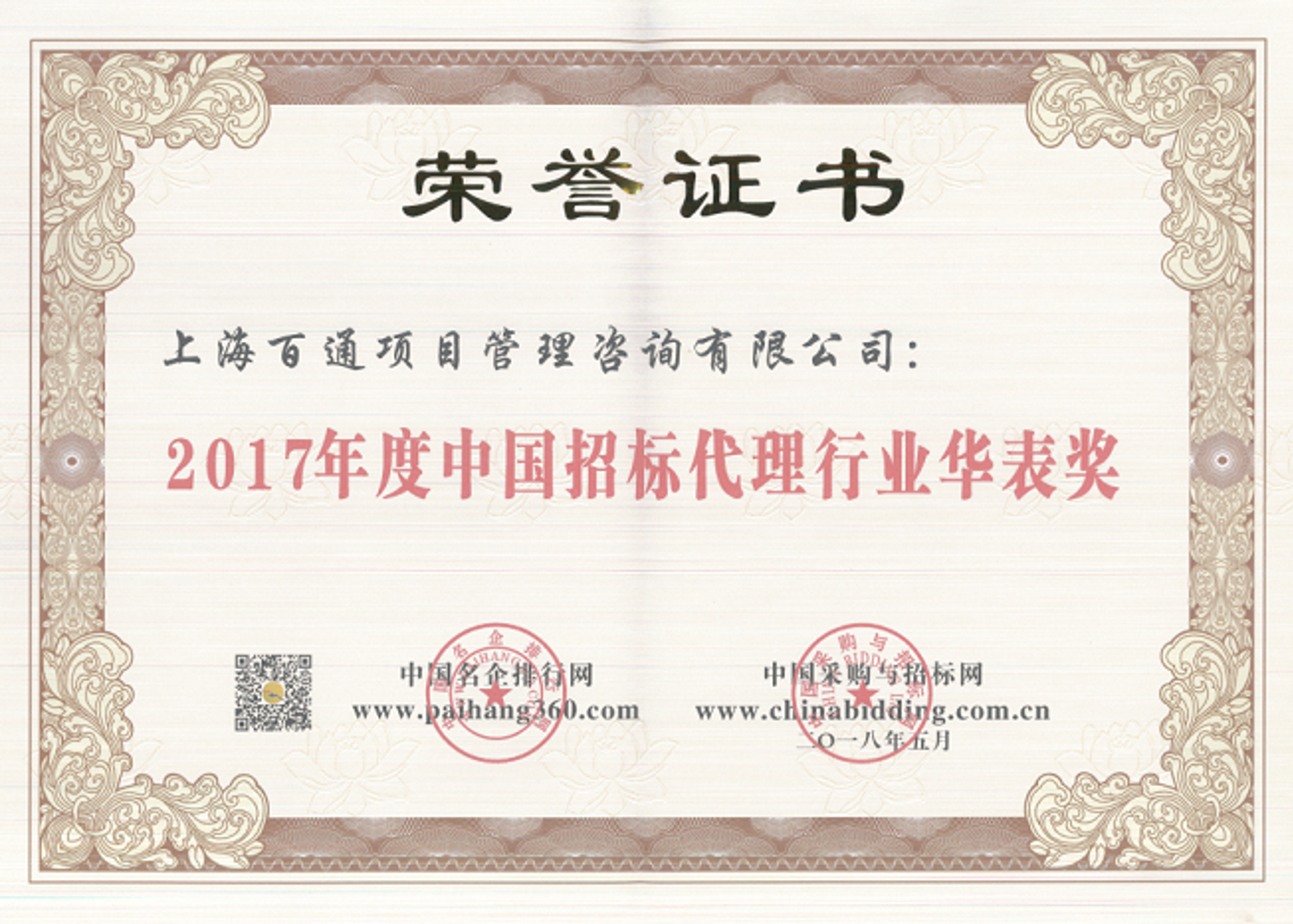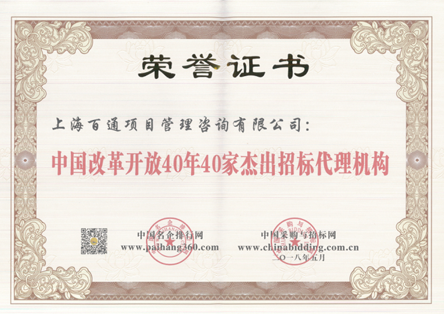 2018年5月9日,“2018第12屆全國招投標領域年度聚焦”活動在北京新疆大廈隆重舉行。本次活動包括兩大議程,分別是“新趨勢、新思維、新工具”高峰論壇及年度聚焦頒獎典禮。我司被授予本次活動最高獎項“中國改革開放40年40家杰出招標代理機構”以及“2017年度中國招標代理行業華表獎”。