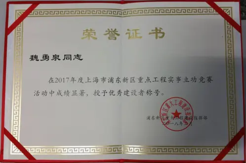 監理部楊高路(世紀大道~浦電路)道路改建工程2標段總監魏勇泉同志,在2017年度上海市浦東新區重點工程實事立功競賽活動中成績顯著,獲浦東新區重大工程建設指揮部授予 “優秀建設者”榮譽稱號。