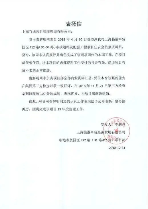 我司監理部上海臨港奉賢園區F12路(D1-D2路)市政道路及配套工程監理項目部員工秦解明,一人身兼安全員與資料員兩職,在工作中,該同志認真履行并出色完成了本職工作。秦解明在監理項目部任勞任怨,將F12項目的內部資料工作安排得井井有條,在臨港集團第三方檢查時獲得一致好評,并在2018年11月21日第三方檢查中拿到監理項100滿分的好成績,表現優異,獲得甲方臨港公司公開表揚。