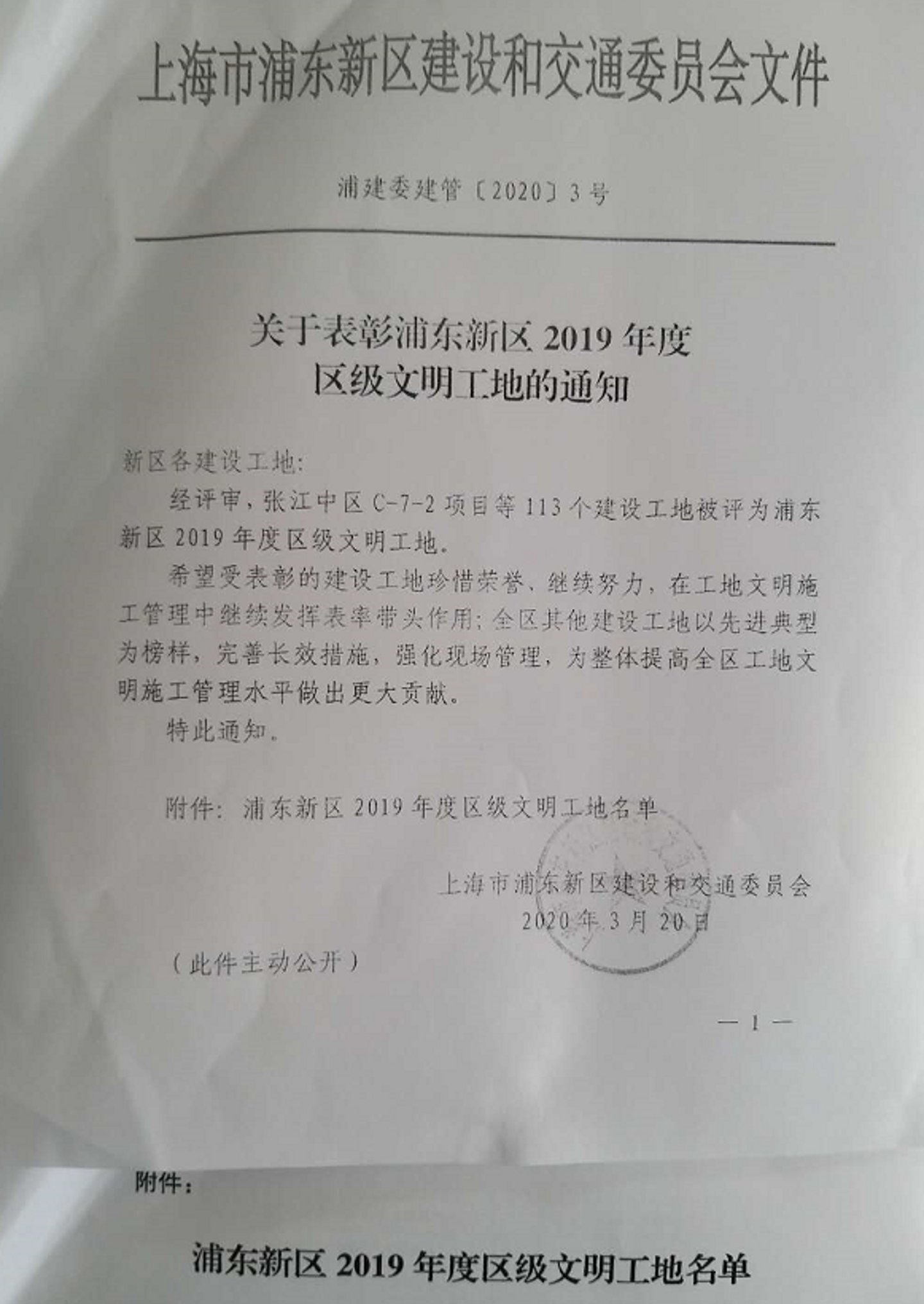 在上海市浦東新區建設和交通委員會開展的浦東新區2019年度區級“文明工地”檢查評比中,我司監理項目濟陽路(盧浦大橋~閔行區界)快速化改建工程2標、浦東新區張江南區配套生活基地C1-04地塊征收安置房項目、張江南區配套生活基地A6-01地塊配套小學新建工程、浦東新區保障房三林基地05-01地塊、浦東新區保障房三林基地02-01地塊、上海市浦東新區民樂大型居住社區K05-01地塊、濰坊九村及十村(一)屋面及相關設施改造項目、浦興路街道銀橋小區屋面及相關設施改造項目被評為“文明工地”(浦建委建管[2020]3號)。