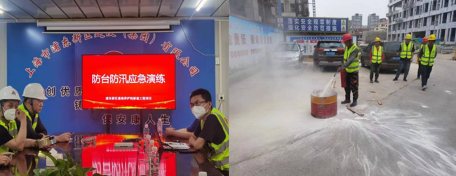 消防演練主要包括演練正確使用消防器材以及關于工地嚴禁明火施工、嚴禁吸煙的教育培訓。防汛防臺演練則設有搶險組、救援疏散組、安全保障組、通訊聯絡組四個小組,各組各司其職,井然有序。