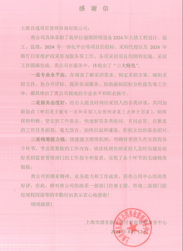“質量月”活動期間涌現了一批先進典型人物,在高質量發展中發揮了中堅帶頭作用。如近日,我司獲上海市浦東新區公用事業管理事務中心致函感謝,盛贊我司在道路照明設備大修、2024年一體化平臺項目招標及采購代理、路燈日常維修咨詢服務中的卓越表現。感謝信特別肯定了我司在專業水平、服務態度與統籌能力方面的杰出貢獻,并對招標代理板塊王璇經理及咨詢二部程園園副經理的辛勤付出表示衷心感謝。