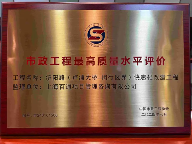 近日,我司收到中國市政工程協會頒發的榮譽證書,表彰我司監理的濟陽路(盧浦大橋至閔行區界)快速化改建工程榮獲2024市政工程最高質量水平評價此獎項是百通監理斬獲的又一國家級榮譽,這不僅是對我司監理高質量服務的肯定,也標志著在市政工程領域的技術水平和管理能力再上新臺階。