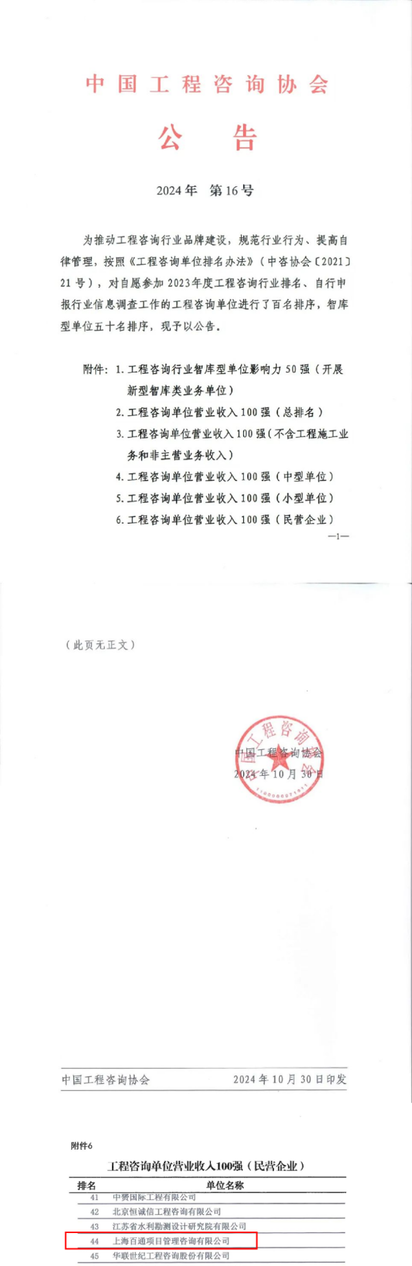 為推動工程咨詢行業品牌建設,規范行業行為,提高自律管理,按照《工程咨詢單位排名辦法》(中咨協會〔2021〕21號),中國工程咨詢協會對自愿參加2023年度工程咨詢行業排名、自行申報行業信息調查工作的工程咨詢單位進行了智庫型單位影響力50強和營業收入100強排序,并發布了2023年度工程咨詢單位行業排名名單(中國工程咨詢協會公告2024年第16號)。