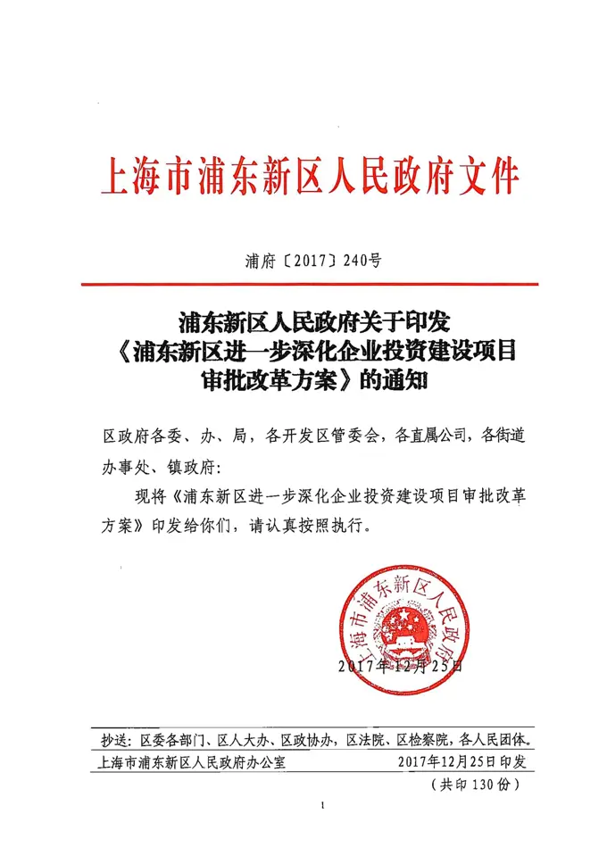 浦东新区人民政府关于印发《浦东新区进一步深化企业投资建设项目审批改革方案》的通知(浦府〔2017〕240号)