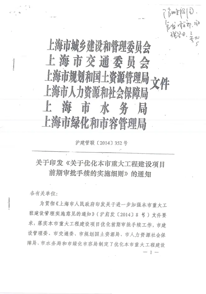 关于印发《关于优化本市重大工程建设项目前期审批手续的实施细则》的通知(沪建管联[2014]352号)