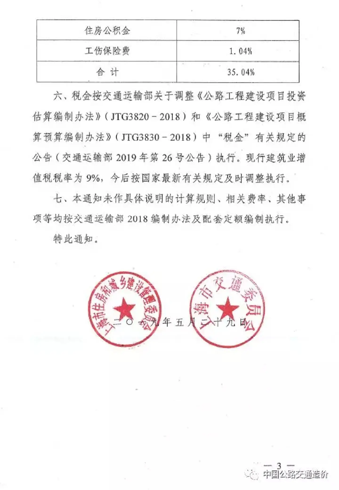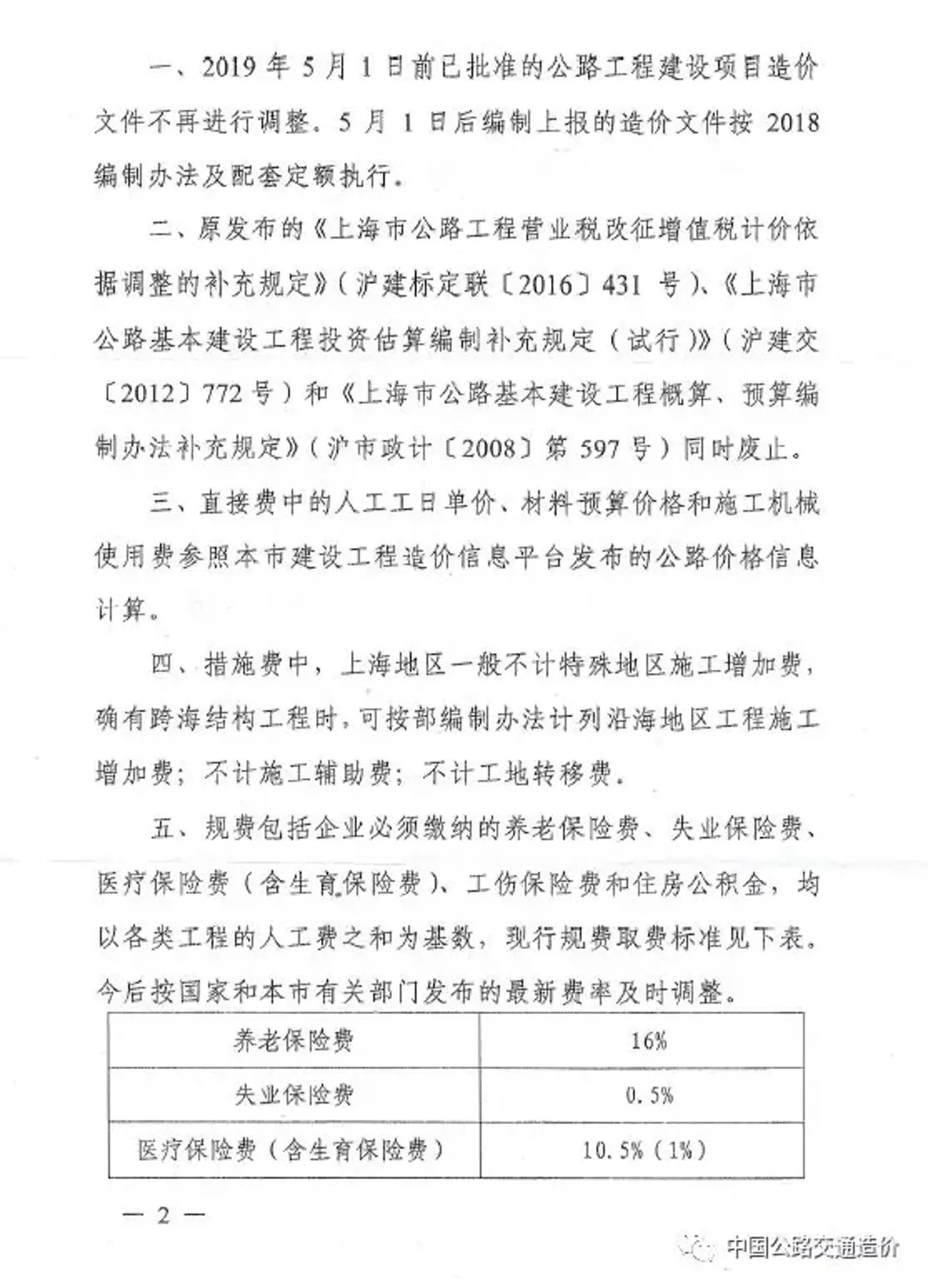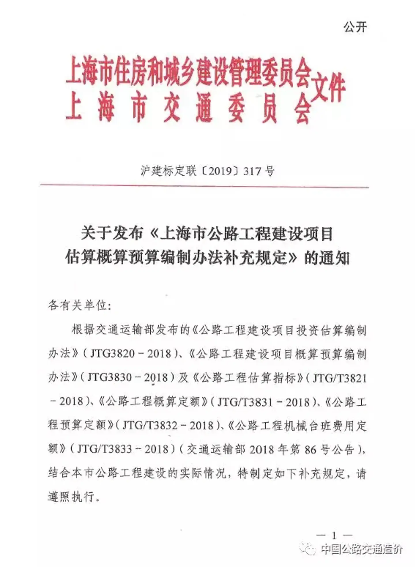 关于发布《上海市公路工程建设项目估算概算预算编制办法补充规定》的通知 沪建标定联〔2019〕317号
