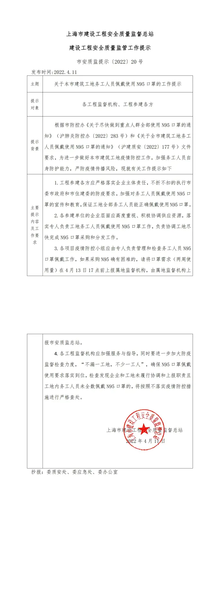 市安质监提示(2022)20号《关于本市建筑工地务工人员佩戴使用N95口罩的工作提示》
