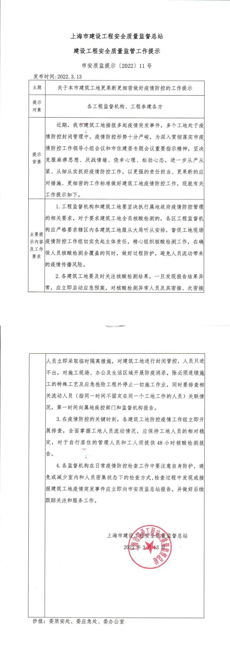 市安质监提示【2022】11号《关于本市建筑工地更果断更细密做好疫情防控的工作提示》