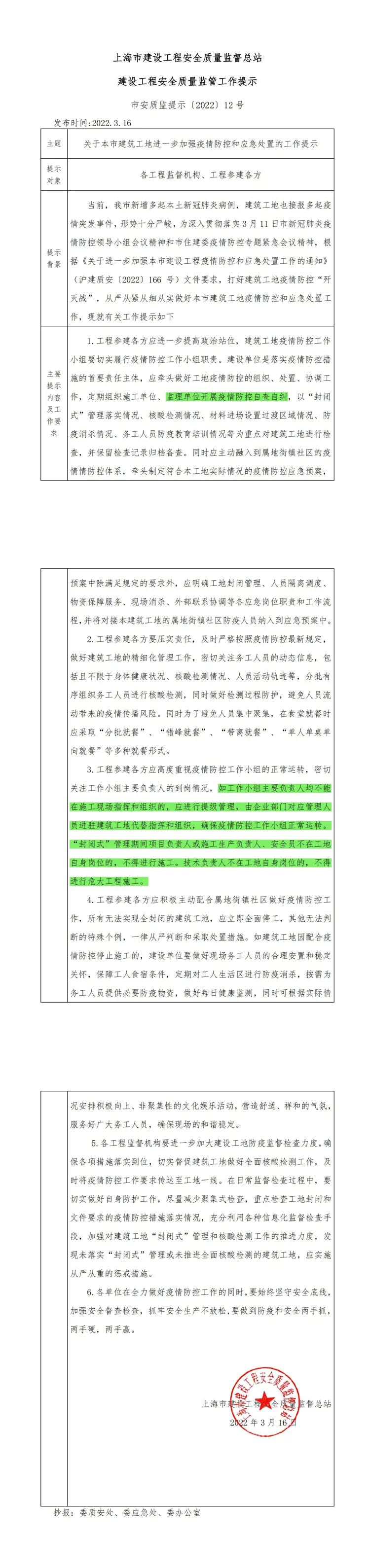 市安质监提示【2022】12 号《关于本市建筑工地进一步加强疫情防控和应急处置的工作提示》