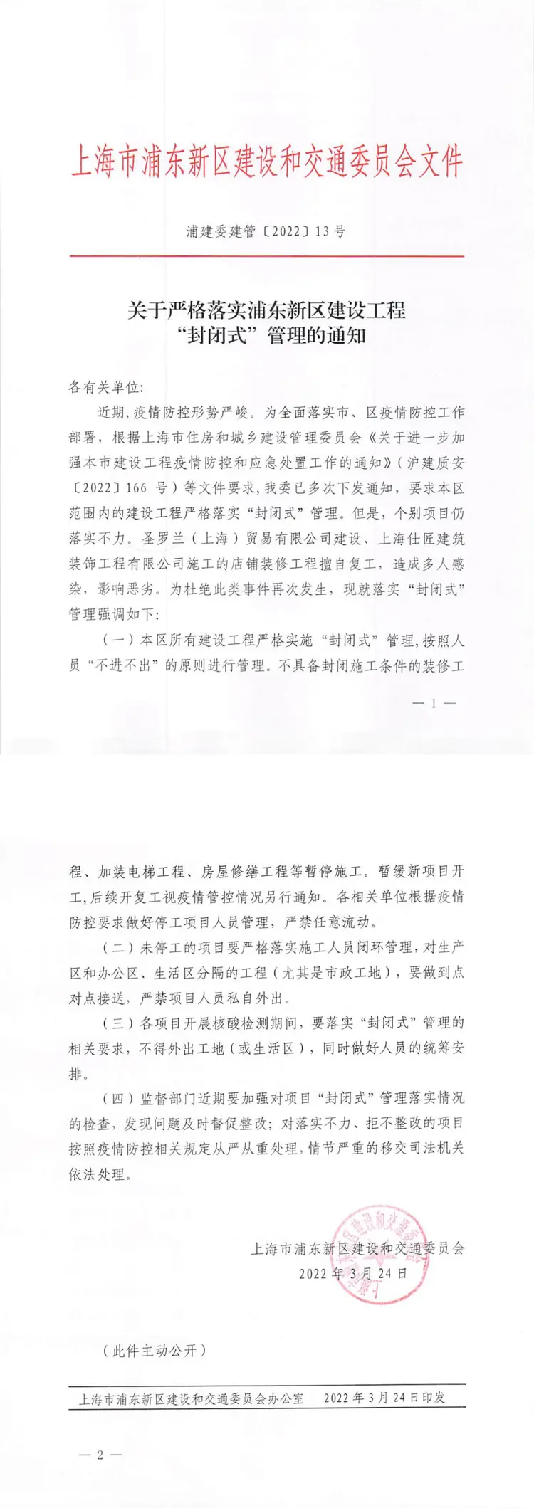 浦建委建管〔2022〕13 号《关于切实落实浦东新区建设工程“封闭式”管理的通知》