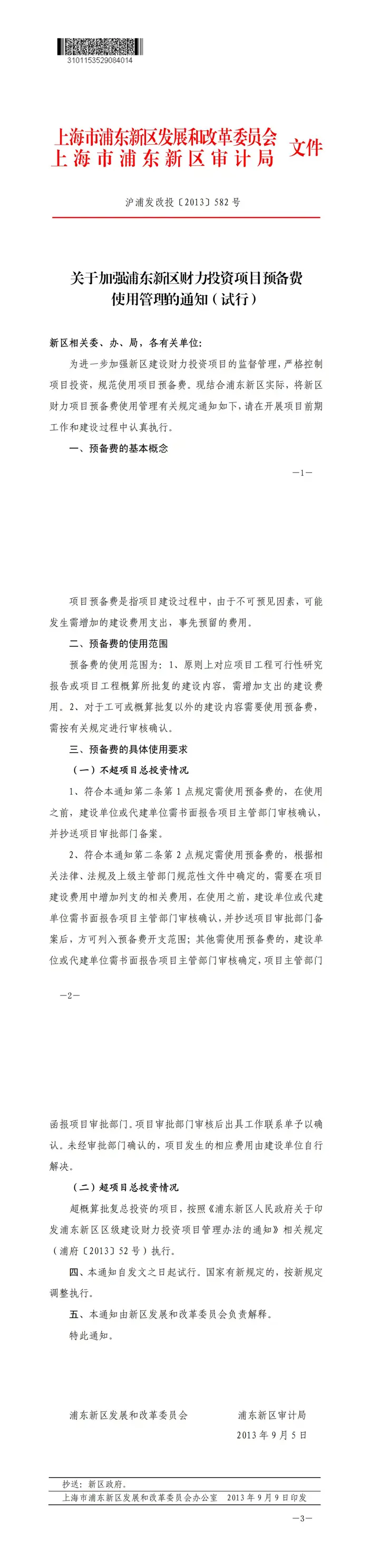 关于加强浦东新区财力投资项目预备费使用管理的通知(试行)【沪浦发改投〔2013〕582 号】