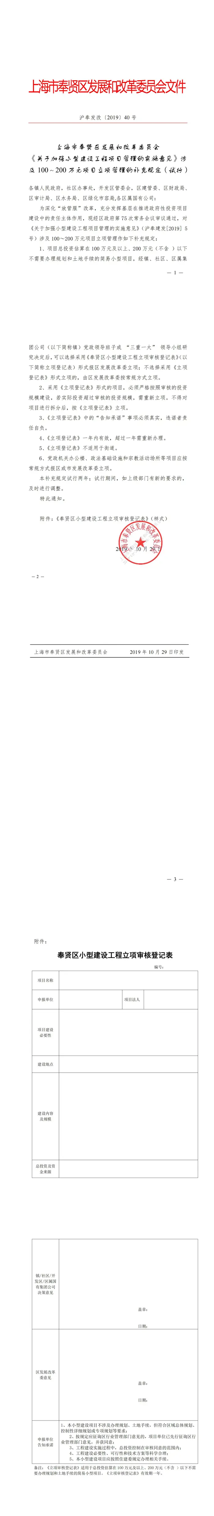 [奉贤]《关于加强小型建设工程项目管理的实施意见》涉及100~200万元项目立项管理的补充规定(试行)【沪奉发改〔2019〕40号】
